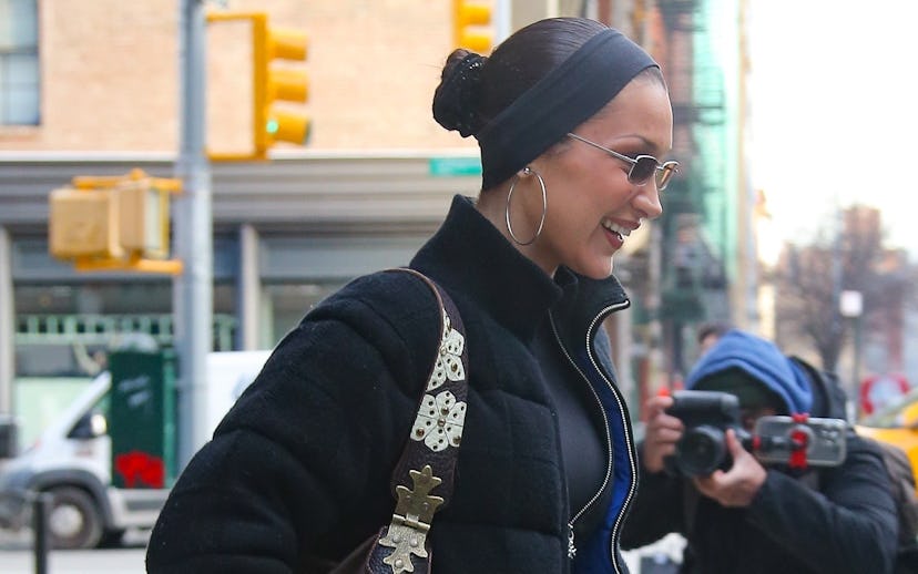 The best winter hair hack? Take notes from Bella Hadid’s thick black headband. Not only is this a sleek way to update a slicked-back bun, but it ensures that your baby hairs are laid and keeps your ears warm in the frigid winter temps. Genius.