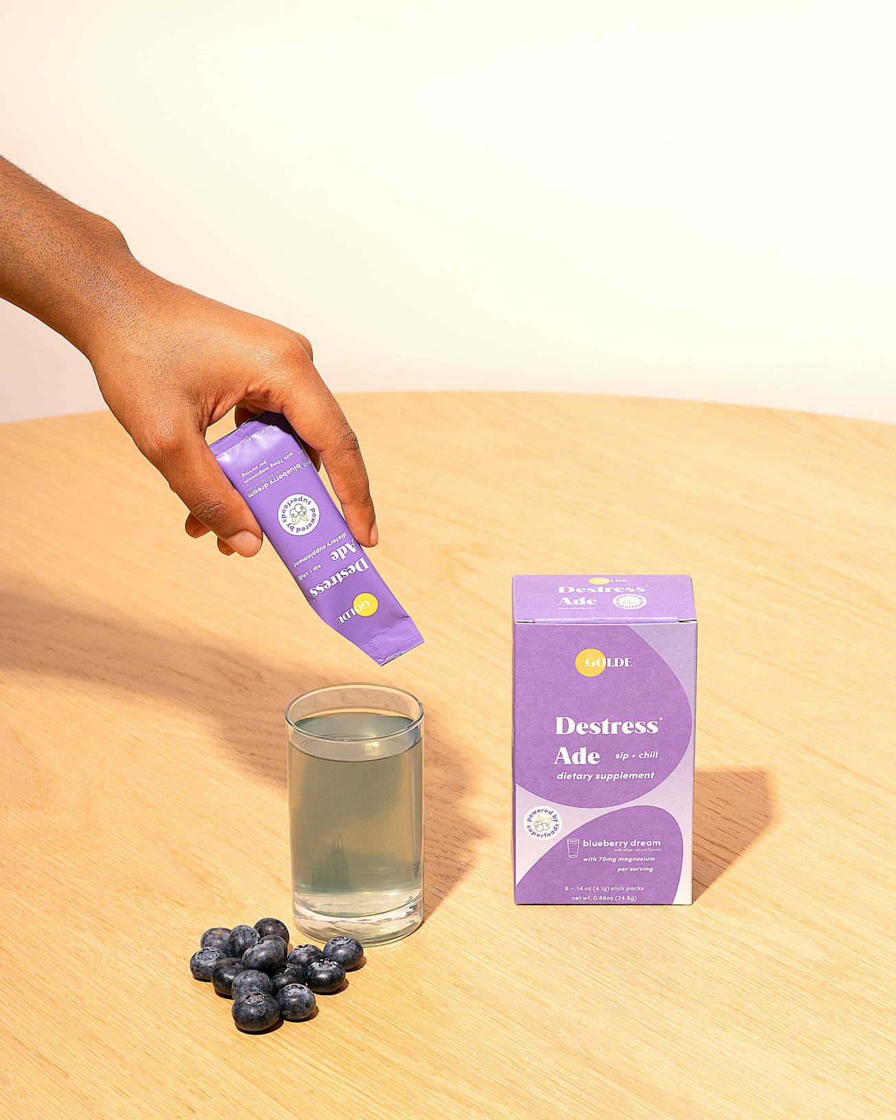 The small business will be joining Target both online and in-store at 460 Target locations nationwide, and introduced Super-Ades, its latest product category, as part of its launch with the retailer. Available in three concern-focused formulas and flavors — blueberry Distress Ade, pineapple Debloat Ade, and watermelon Skin Hydration Ade — the Super-Ades are Golde's first-ever ingestible supplements, offered in the form of powder packets that dissolve easily and immediately into cold water. Each box contains 6 single-serving stick packs for $15.