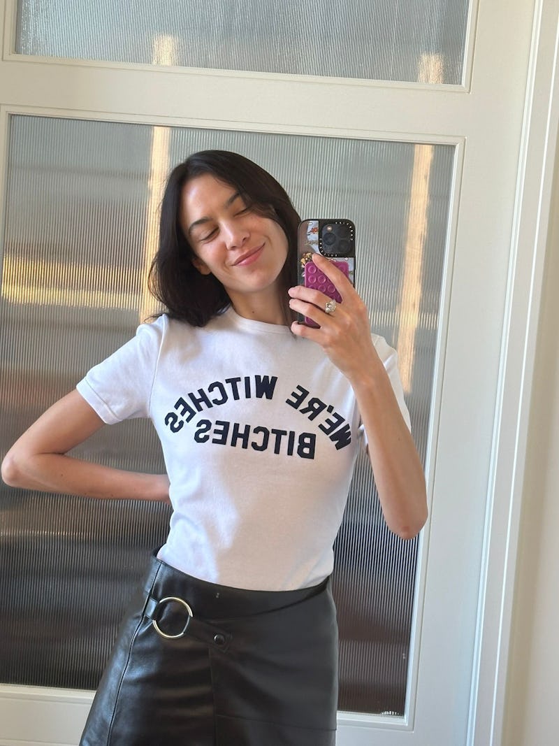 This appreciation for “tarting up the everyday,” as she puts it, makes shopping in her universe feel like a special treat. While she enjoyed the fall weather of New York, Chung dialed in with NYLON to talk about her inspirations, if skinny jeans are really back, jewelry over coats, why she doesn’t like going-out tops, and which Godfather movie is actually the best. She also gave us an exclusive Instagram-style photo dump, seen below, to highlight how seamlessly the latest collection folded up into her carry-on and matched with her other seasonal must-haves (it is an ugly-floral-dress fall, after all, and she’s got our favorite one from Prada, natch).