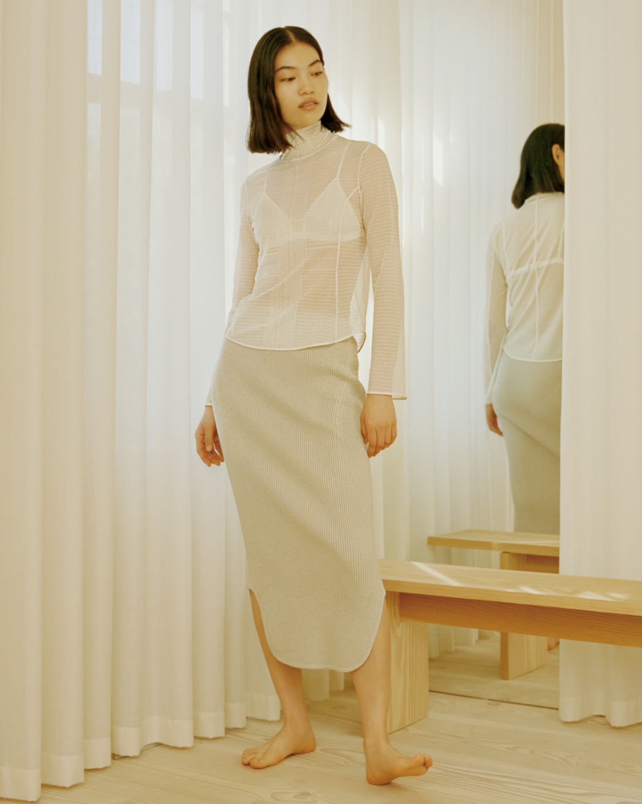 The innerwear collection fuses intentional Japanese tailoring and luxurious, sheer fabric in colors inspired by the natural world: golden ears of rice, autumn leaves, and overcast days. Our favorites include a mesh high-neck T-shirt and a mesh bra bodysuit, which add a sensual flair to a winter wardrobe.