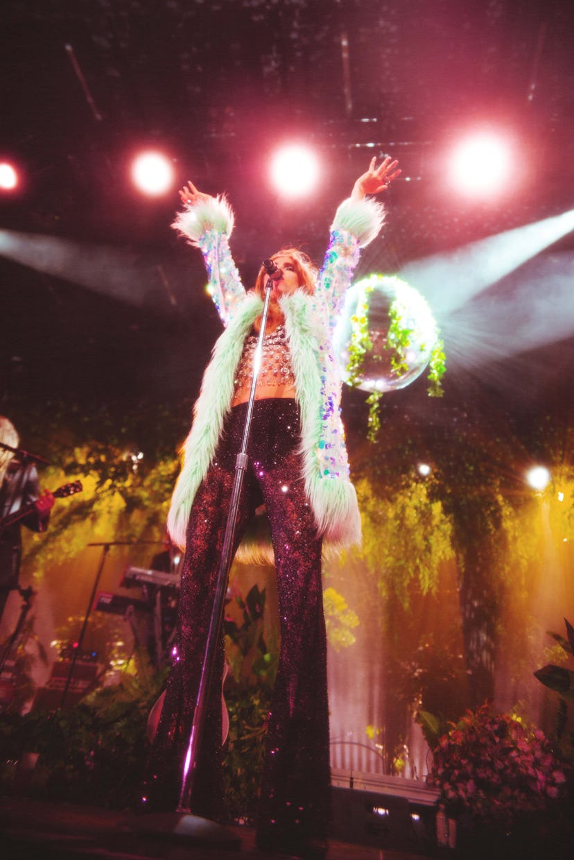 Waterhouse has become one of music’s greatest showmen over the past few years, and for her The Sparklemuffin Tour, in support of her latest album, Memoir of a Sparklemuffin, she’s making her stage more shimmery than ever. “We went full sparkle in Brooklyn,” Waterhouse tells NYLON. “I had this incredible robe from Club Exx and, of course, the massive disco ball that is with us every show. I had so much fun designing the stage, I really wanted to transport everyone to the Sparklemuffin forest and escape into that each night.”